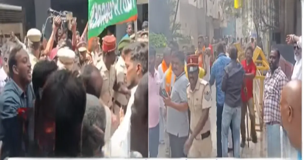 பரபரப்பு வீடியோ...!! காங்கிரஸ், பாஜகவினரை விரட்டி விரட்டி வெளுத்த போலீசார்... கற்கள், காலணிகளை வீசித் தாக்குதல்...!!