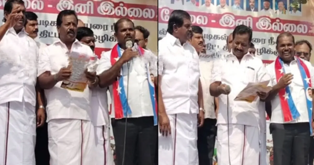 கரூர் மாவட்டம் குத்தளையில் ஆர்ப்பாட்டம் நடைபெற்றது. 100 நாள் வேலை இனி இல்லை எனக் கூறி தமிழகம் முழுவதும் திமுக கூட்டணிக் கட்சிகள் ஆர்ப்பாட்டம் நடத்தின. அப்போது, மாநில அரசு, மத்திய அரசைக் கண்டிக்கிறது எனக் கூறி முழக்கம் எழுப்பிய போது கவனக்குறைவு ஏற்பட்டது. மாநில அரசைக் கண்டிக்கிறோம் என மேடையில் இருந்தவர்கள் முழக்கம் எழுப்பியதால் சிரிப்பலை ஏற்பட்டது.