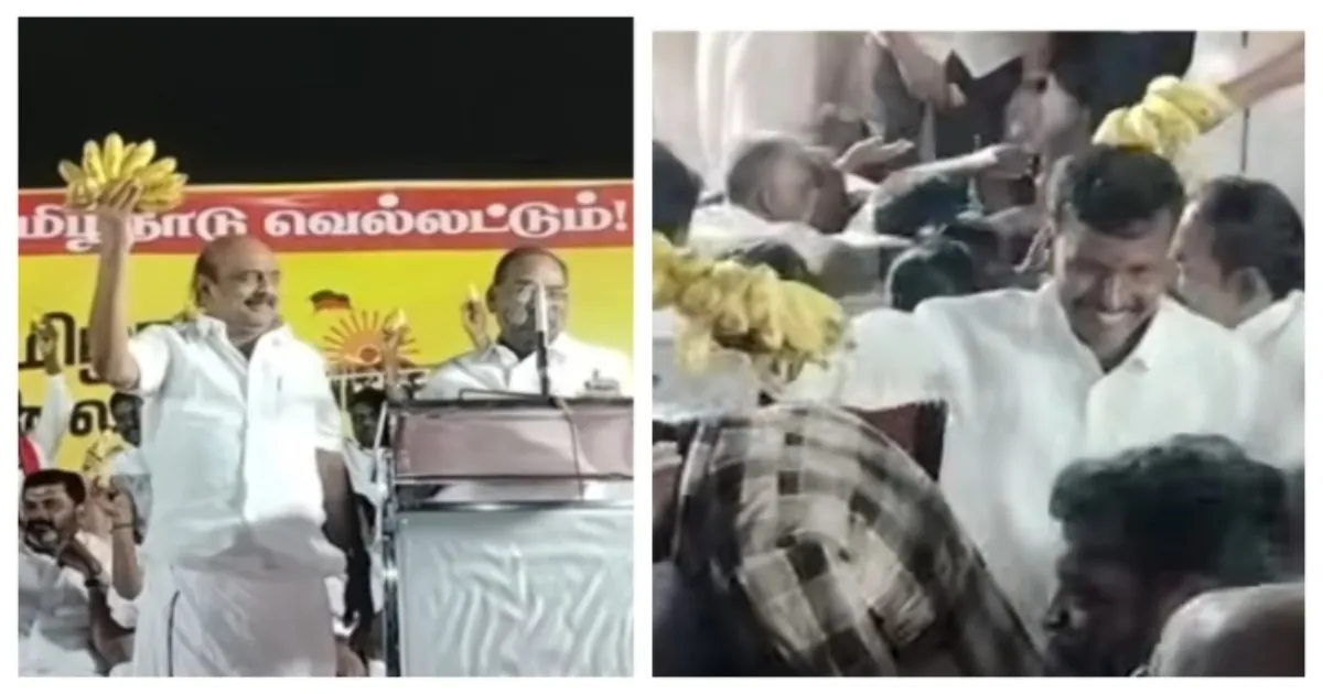 அதன் தொடர்ச்சியாக, இன்று திருப்பூரில் நடைபெற்ற “தமிழ்நாடு தலைகுனியாது” என்ற தேர்தல் பரப்புரை கூட்டத்தில், அங்கு திரண்டிருந்த பொதுமக்களுக்கு திமுகவினர் வாழைப்பழம் வழங்கினர். தமிழ்நாட்டிற்கு மத்திய அரசு பட்ஜெட்டில் வாழைப்பழம் கொடுக்கப்பட்டதாகவும், அவர்களுடைய வறுமையை பறைசாற்றும் வகையில் மக்களுக்கு வாழைப்பழம் கொடுப்பதாகவும் தெரிவித்தனர். திமுக நிர்வாகிகள் மேடையில் இருந்த படியே வாழைப்பழங்களை வழங்க, கூட்டத்தில் இருந்த பொதுமக்கள் முண்டியடித்துக் கொண்டு அதனை வாங்கிச் சென்றனர்.